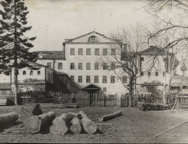 Вероятно, еще в 1860-х гг. из состава имения выбыл левый флигель, впоследствии ставший депо местного пожарного общества. План земельного участка, составленный в 1903 г. землемером Д.В. Тюменевым (31), характеризует структуру усадьбы в начале ХХ века. Там, в частности, обозначен правый флигель, названный каменным навесом. Возможно, такой статус был связан с нецелостной структурой здания, прежде включенного в комплекс производственных помещений. Левый флигель представлял собой значительно вытянутый в длину каменный корпус. Прежде он мог включать в себя производственные или хозяйственные помещения, но в данный период это было лишь «место бывшаго каменнаго строения, предполагаемое для трубной вольно-пожарного общества». В задней части имения располагалась каменная угольная кладовая, вероятно, являвшаяся одним из ранее перечисленных дворовых зданий. Сохранялся сад, в котором находилась деревянная баня. Как следует из плана, к началу ХХ века было утрачено большинство располагавшихся на дворе хозяйственно-производственных построек.