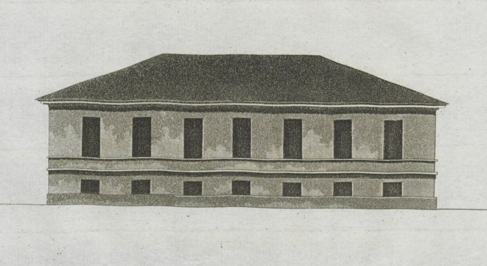 В 1805 году Переславцевы планировали построить деревянный дом, но в 1810-х годах возводится каменный, сохранившийся до наших дней (улица О. Берггольц, № 6). Это было довольно крупное одноэтажное здание с высоким цокольным этажом. По главному фасаду пять окон, по протяжённым боковым – восемь-девять. По всей видимости, для него был использован образцовый фасад № 23 из первого альбома 1809 года – наиболее простой образцовый проект. Помимо прямоугольных окон композицию формируют профилированный карниз и белокаменный междуэтажный поясок. Облик здания прост, схематичен, но выверенные классические пропорции придают благородство и выразительность. Уже на раннем этапе над каменным объёмом надстраивается деревянный оштукатуренный верхний этаж-мезонин, заметно укрупнивший здание.