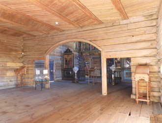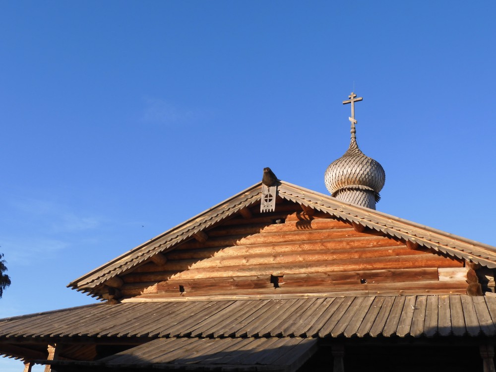 Убранство зимнего храма было скромнее, но при этом находилось паникадило о двенадцати шандалах, а деисусный ряд иконостаса состоял из одиннадцати икон. Вместе летний и зимний храмы образовывали традиционный для отечественного зодчества ансамбль. Хотя это были церкви клетского типа, не стоит недооценивать их размеры и облик. Они могли быть довольно значительными. Поверх кровли, по крайней мере у одной, возвышалась шатровая глава – декоративное завершение, отличимое от конструктивного типа шатровых церквей.