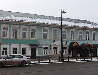Второй этаж здания целостно сохраняет простую и логичную композицию, но первый в немалой степени был подвержен изменениям. Напомню, что в центре расположена довольно крупная проездная арка во двор. Левое крыло (ныне ТИЦ) занимали помещения постоялого двора. Вход в них был из проезда арки, поэтому дверь по фасаду отсутствовала – существующая была пробита в 2009 году. Примечательно, что второе и четвертое окна от угла вместе с наличником углублены в ниши. Причина такого композиционного решения неизвестна, – возможно, в правом крыле изначально присутствовала похожая композиция.