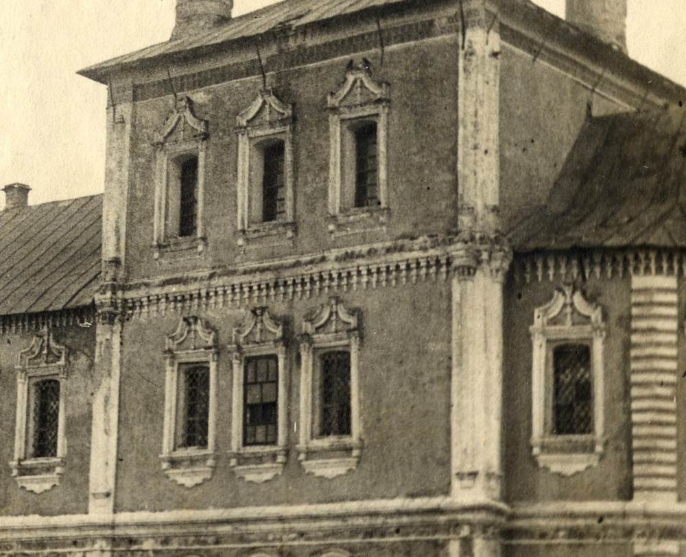 Особого внимания заслуживали пояски первого и второго ярусов. В основании стен был цоколь, окаймлённый парой валиков. Междуэтажный пояс-карниз имел сложную форму – состоял из профилированных тонких тяг и наклонного скоса. Ниже проходил тонкий валик. Второй ярус окаймляло ожерелье фигурных городков. На объёме храмовой части поясок также сочетался со скосом из наклонно поставленных кирпичей. Эти скосы имели двойное назначение – оформляли поярусное сужение стен и служили для отвода влаги. Вместе с капителями, основаниями колонок и выступами карнизов они образовывали сложную логически выверенную композицию. Под крышей храмовой части вместо обычного карниза проходил фриз из двух рядов рельефных изразцов, окаймлённых тягами. Напомню, что каждый ряд насчитывал примерно по 70 штук. Следовательно, весь фриз составляли примерно 560 изразцов. Это была уникальная особенность Леонтьевского храма! Вместе с охристо-белой окраской фасадов, зелёными кровлями, главами и золочёными крестами изразцы сообщали зданию яркую полихромию.
