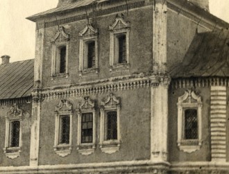 Наличники нижнего этажа были существенно скромнее, хотя и более сложны, декоративны, чем подобные детали церкви Флора и Лавра. Они включали тонкие колонки, карнизы и приподнятые лучковые сандрики с плечиками. Наличники окон алтаря были с треугольными сандриками.
