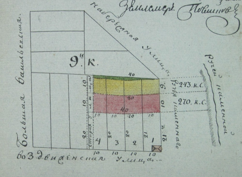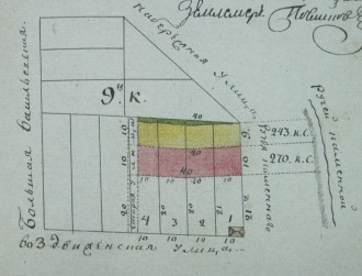 Затем 30 апреля 1799 года последовала данная (документ на право владения недвижимым имением) «в том, что по прошению твоему об освидетельствовании для построения каменного дома о двух этажах со службами на 30 саженях собственной твоей земли, коя в сходство заключённой резолюции оного общего Присутствия (Городового Магистрата и городничего коллежского асессора М.Е. Юзвицкого) при посредстве уездного землемера Микулина при просителях, имеющих в подходящих землях участки хозяевах, свидетельствована и оказалась лицом на Воздвиженскую улицу с приобщением старой дороги для дома со службами 30 сажен, с подходящею взади посацкого Василья Багровникова и прочих, от коих при свидетельстве и отводе их участков никакого противоречия не изъявлено. Почему оное место за тобою утверждено, о чём и о сочинении на оное плана и о доставлении в сие Присутствие сообщено было уездному землемеру. Вследствие чего землемером план сочинён и в сей Магистрат доставлен. И из него означается, что место твоё состоит под № 207-м, мерою по лицу и взади по 30, а в длину со обоих сторон по 40 сажен. И для того определено: на означенное утверждённое за тобою место на вечное и потомственное владение дать тебе данную, напомянув во оной, чтоб вы за подходящие соседственные земли участки доставили прежним владельцам удовлетворение, а потом в первый год заготовили к построению все потребные материалы, во второй приступили к построению, а в [пятый] непременно окончили под опасением за неисполнение сего отдачи того места другим желающим застроить в изъяснённый срок. Данную же по получении следующего по силе Высочайшего о губерниях учреждения 290-й статьи исполнения явил в сей Магистрат особо».