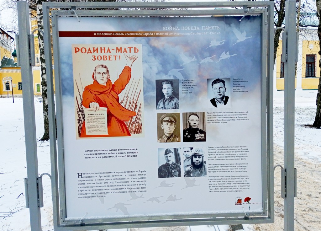 Планшетная выставка в формате оупен-эйр на площадке Угличского кремля. Восемь тематических двухсторонних планшетов, на которых представлены рассказы и фотографические материалы о знаковых датах, битвах и событиях Великой Отечественной войны, участии угличан-ветеранов войны, их подвигах и наградах.