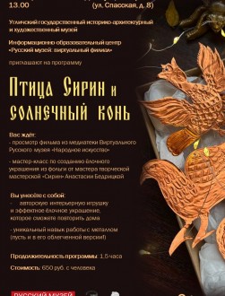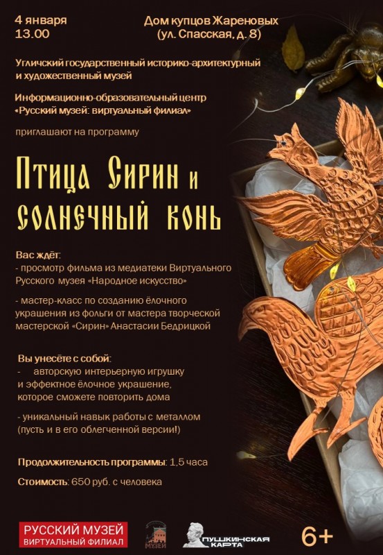 4 января 2026 года в 13:00 Угличский музей и информационно-образовательный центр «Русский музей: виртуальный филиал» приглашают на сборную программу для индивидуальных посетителей «Птица Сирин и солнечный конь».